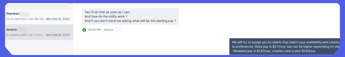 Speed matters in home care hiring. With in-product SMS, you can send and receive messages directly within HelloHire—keeping communication fast, personal, and organized in one place.