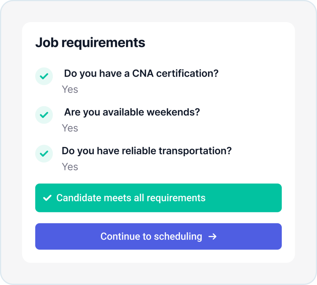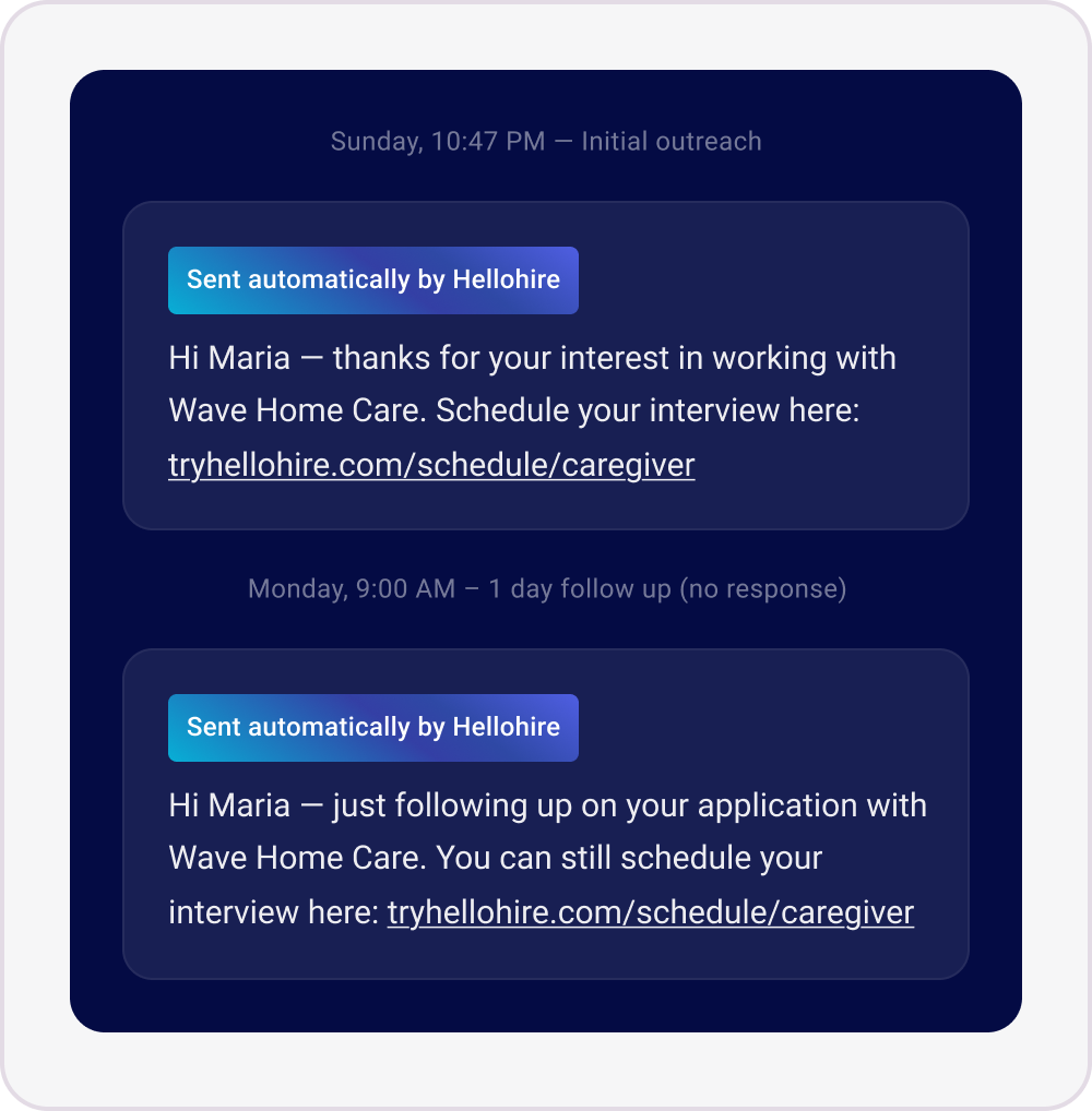 Whether a caregiver applies through Indeed, your ATS, your website, or email, Hellohire picks it up instantly and starts the process automatically.